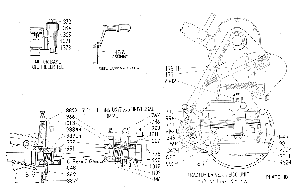 | Plate 10 | Motor Base Oil Filler Tee , Side Cutting Unit and Universal Drive , Tractor Drive and Side Unit Bracket for Triplex |