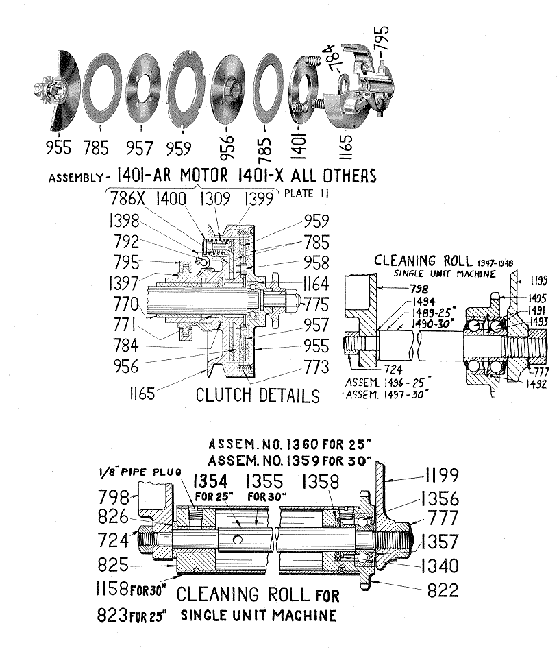 | Plate 11 | Assembly - 1401-AR Motor 1401-x All Others , Clutch Details , Cleaning Roll for Single Unit Machine |