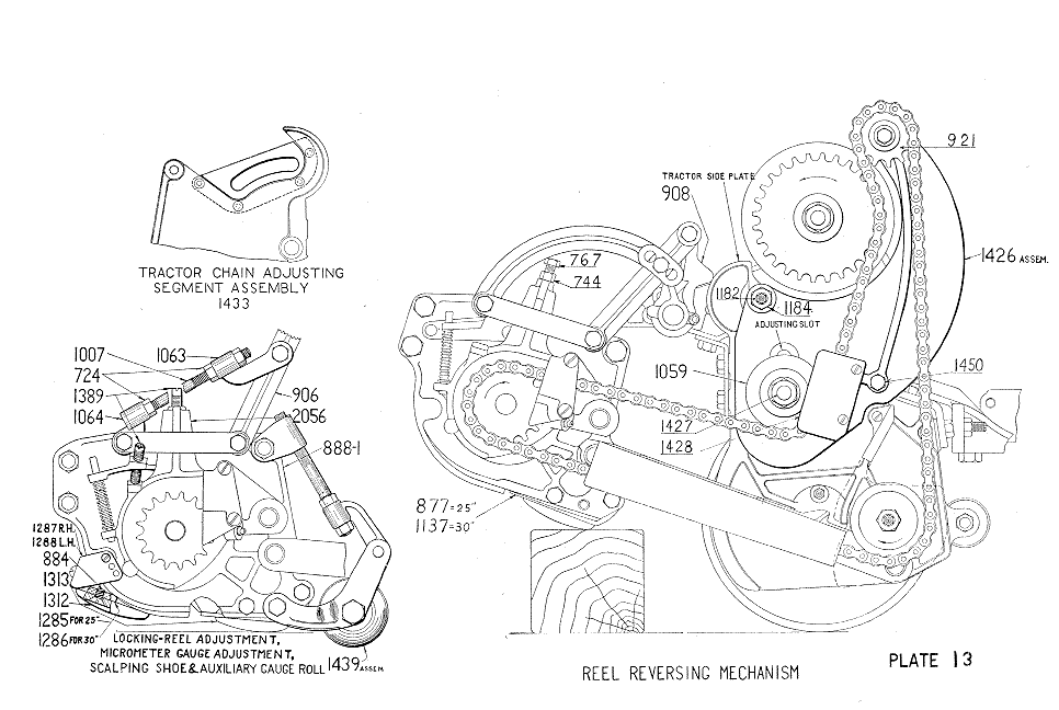 | Plate 13 | Tractor Chain Adjusting Segment Assembly 1433 , Locking - Reel Adjustment, Micrometer Gauge Adjustment, Scalping Shoes & Auxiliary Gauge Roll , Reel Reversing Mechanism |