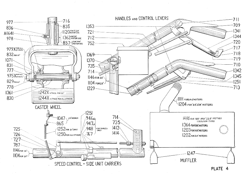 | Plate 4 | Handles and Control Levels , Speed Control - Side Unit Carriers , Muffler |
